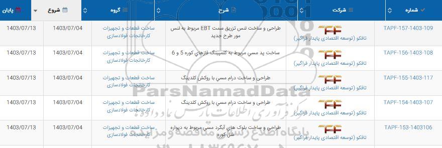 | TAPF-153-1403106 | (تافکو) توسعه اقتصادی پایدار فراگیر | طراحی و ساخت بلوکهای آبگرد مسی مربوط به دیواره شل کوره | ساخت قطعات و تجهیزات کارخانجات فولادسازی | 1403.7.13 |