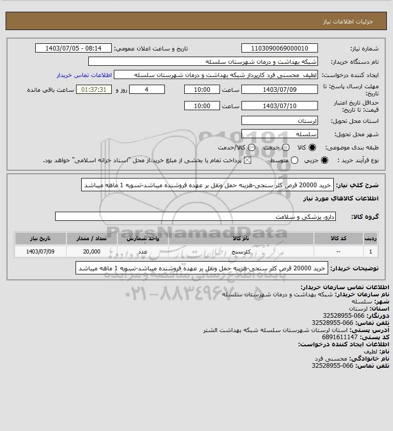 شرح کلی نیاز: خرید 20000 قرص کلر سنجی-هزینه حمل ونقل بر عهده فروشنده میباشد-تسویه 1 ماهه میباشد