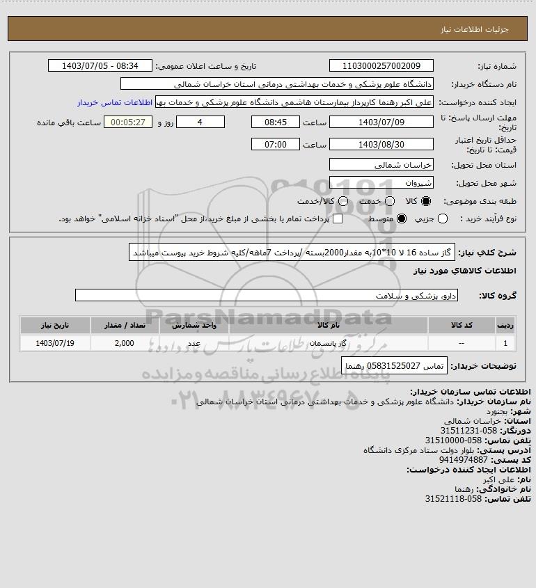 شرح کلی نیاز: گاز ساده 16 لا 10*10به مقدار2000بسته /پرداخت 7ماهه/کلیه شروط خرید پیوست میباشد