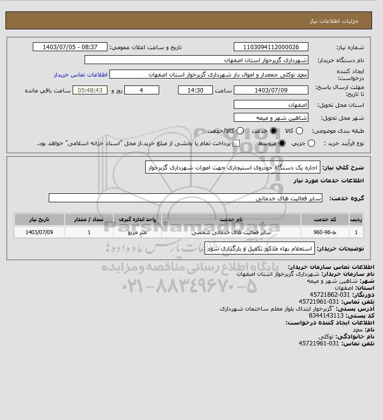 شرح کلی نیاز: اجاره یک دستگاه خودروی استیجاری جهت امورات شهرداری گزبرخوار