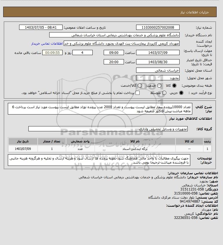 شرح کلی نیاز: تعداد 10000پرونده بیمار مطابق لیست پیوست و تعداد 2000 عدد پرونده نوزاد مطابق لیست پیوست مورد نیاز است