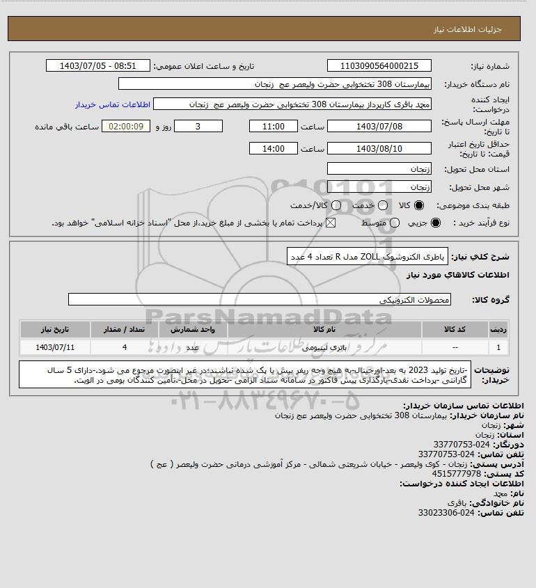 شرح کلی نیاز: باطری الکتروشوک ZOLL مدل R تعداد 4 عدد