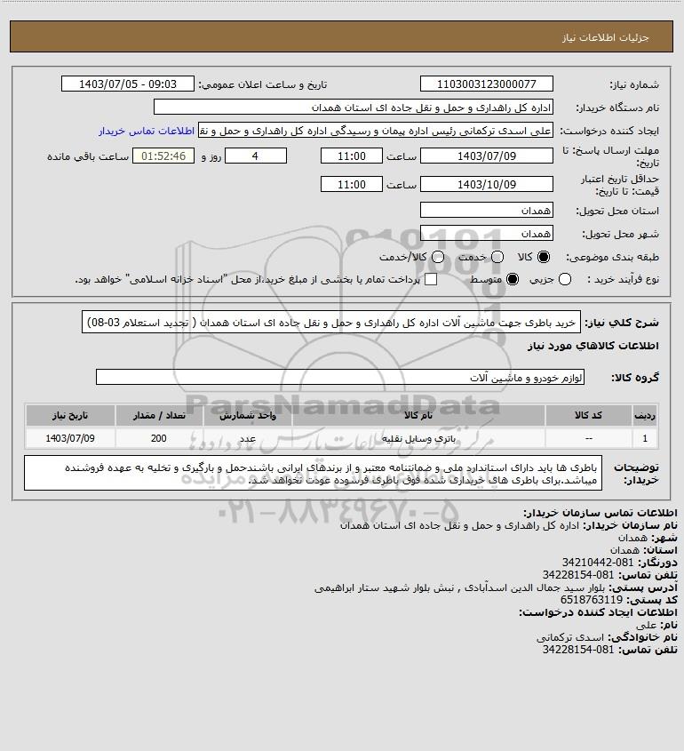 شرح کلی نیاز: خرید باطری جهت ماشین آلات اداره کل راهداری و حمل و نقل جاده ای استان همدان ( تجدید استعلام 03-08)