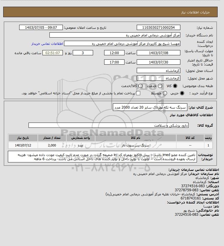 شرح کلی نیاز: سرنگ سه تکه لوئرلاک سایز 20 تعداد 2000 عدد