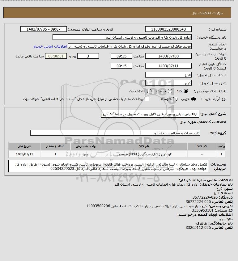 شرح کلی نیاز: لوله پلی اتیلن و غیره طبق فایل پیوست تحویل در ندامتگاه کرج