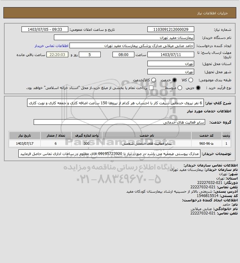شرح کلی نیاز: 6 نفر نیروی خدماتی شیفت کار با احتساب هر کدام از نیروها 150 ساعت اضافه کاری و جمعه کاری و نوبت کاری