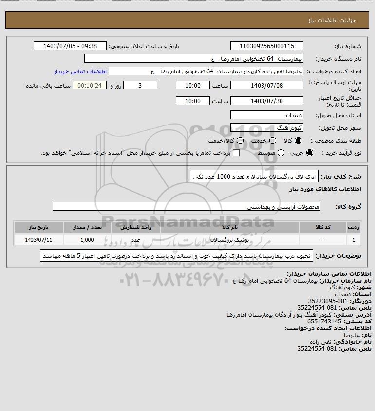 نام سازمان خریدار: بیمارستان 64 تختخوابی امام رضا ع