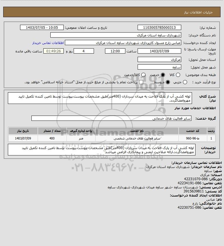 شرح کلی نیاز: لوله کشی آب از پارک فلاحت به میدان سرداران (400متر)طبق مشخصات پیوست،پیوست توسط تامین کننده تکمیل تایید مهروامضاگردد.