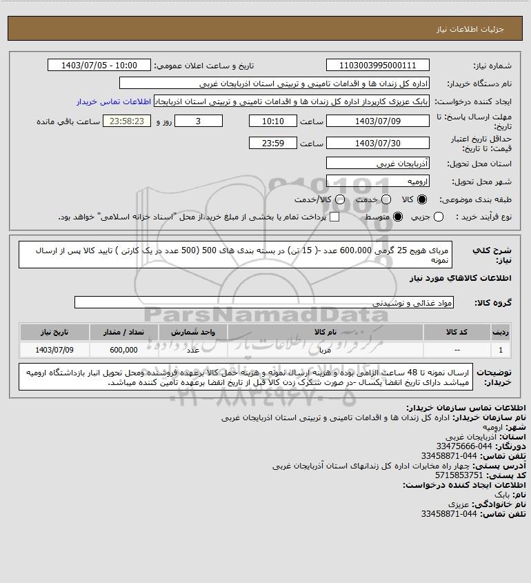 | 1 | -- | مربا | عدد | 600,000 | 1403/07/09 |