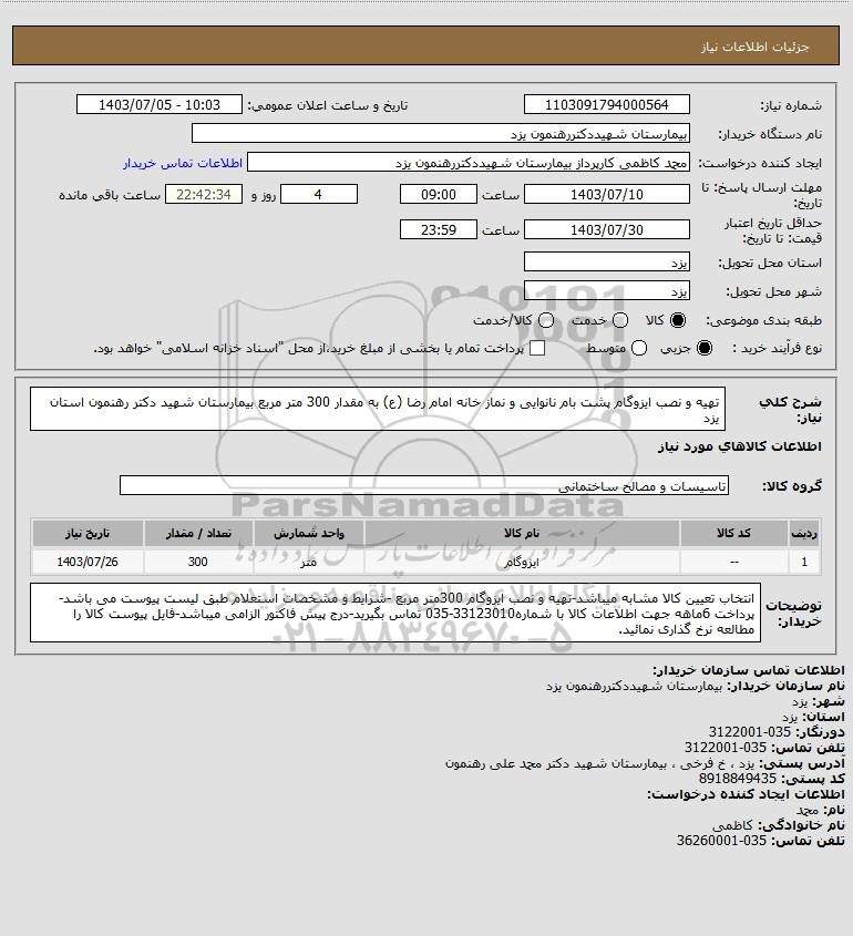 شرح کلی نیاز: تهیه و نصب ایزوگام پشت بام نانوایی و نماز خانه امام رضا (ع) به مقدار 300 متر مربع بیمارستان شهید دکتر رهنمون استان یزد