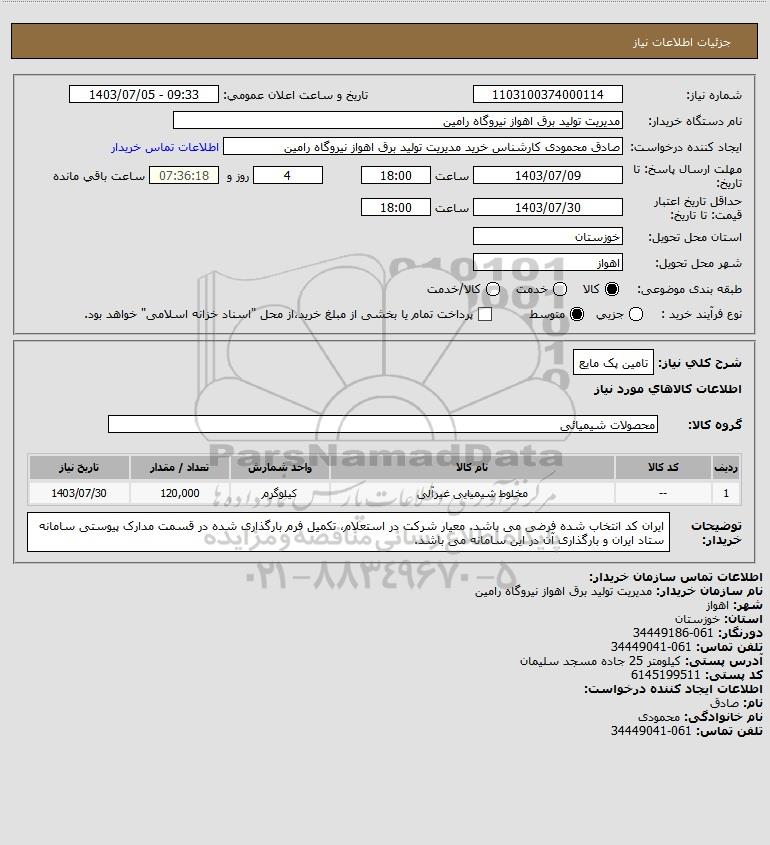 نام سازمان خریدار: مدیریت تولید برق اهواز نیروگاه رامین