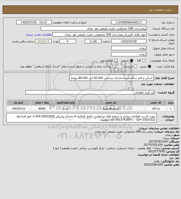 شرح کلی نیاز: اسکن و لاغر سازی پرونده مدارک پزشکی 50.000 الی 80.000 پرونده