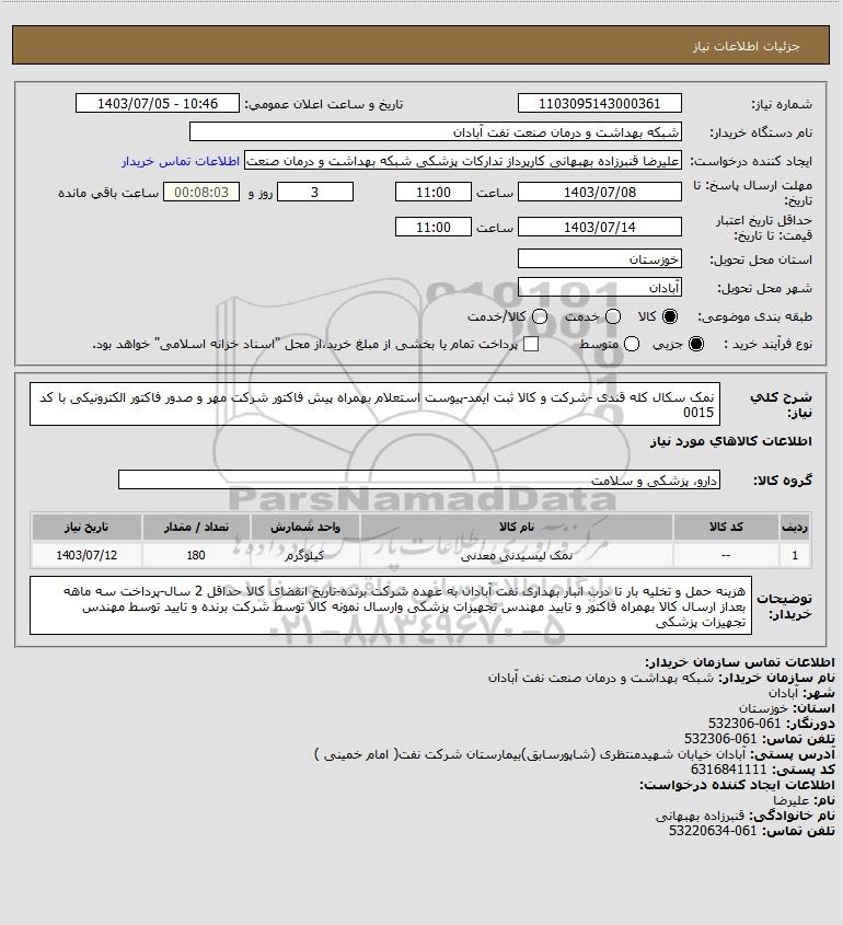شرح کلی نیاز: نمک سکال کله قندی -شرکت و کالا ثبت ایمد-پیوست استعلام بهمراه پیش فاکتور شرکت مهر و صدور فاکتور الکترونیکی با کد 0015