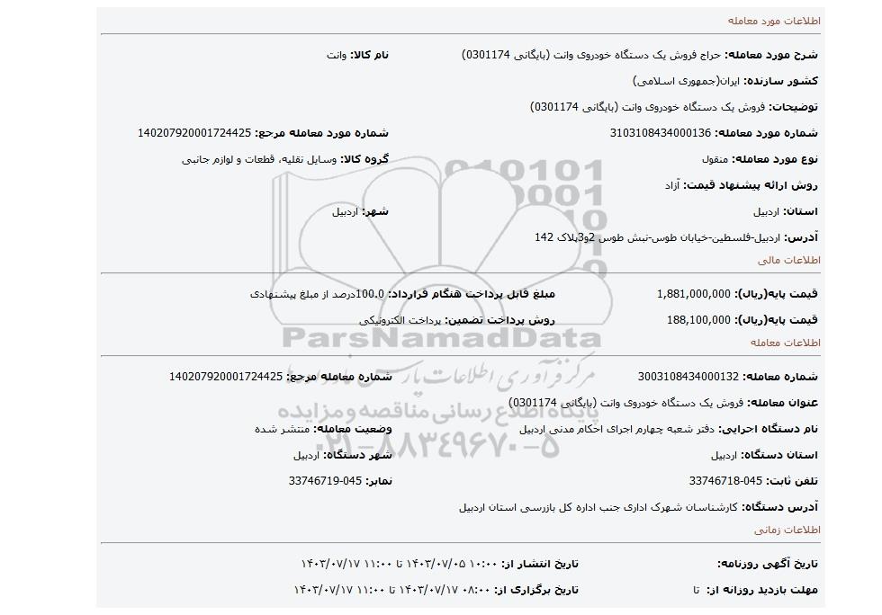 عنوان معامله: فروش یک دستگاه خودروی وانت (بایگانی 0301174) | ||