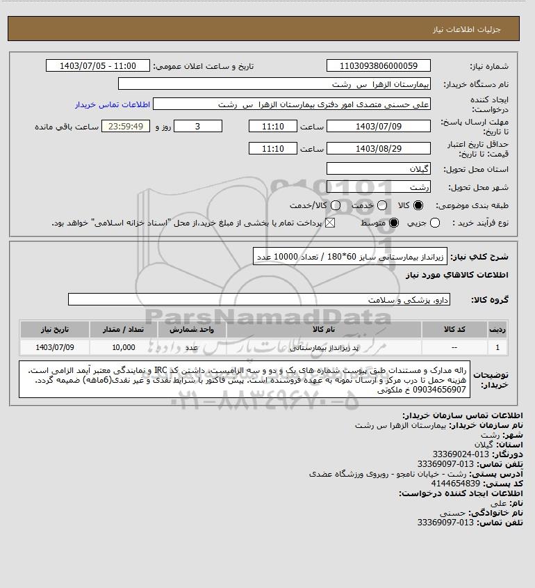 شرح کلی نیاز: زیرانداز بیمارستانی سایز 60*180 / تعداد 10000 عدد