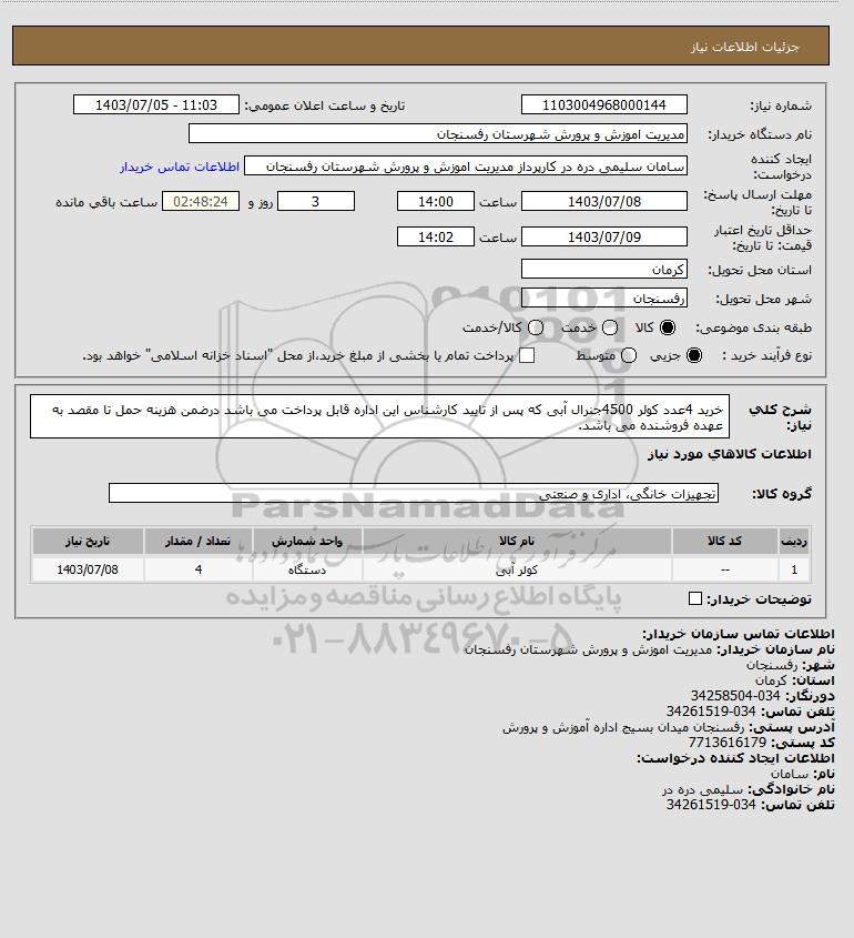 شرح کلی نیاز: خرید 4عدد کولر 4500جنرال آبی که پس از تایید کارشناس این اداره قابل پرداخت می باشد درضمن هزینه حمل تا مقصد به عهده فروشنده می باشد.