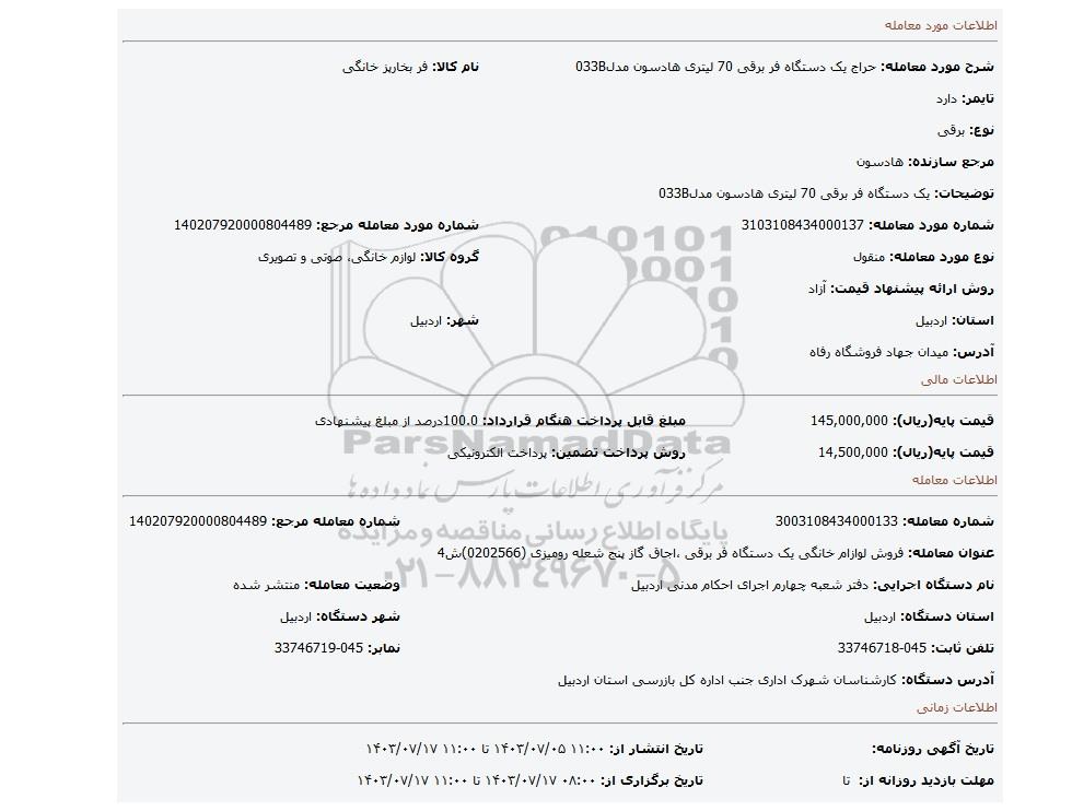 نام دستگاه اجرایی: دفتر شعبه چهارم اجرای احکام مدنی اردبیلوضعیت معامله: منتشر شده