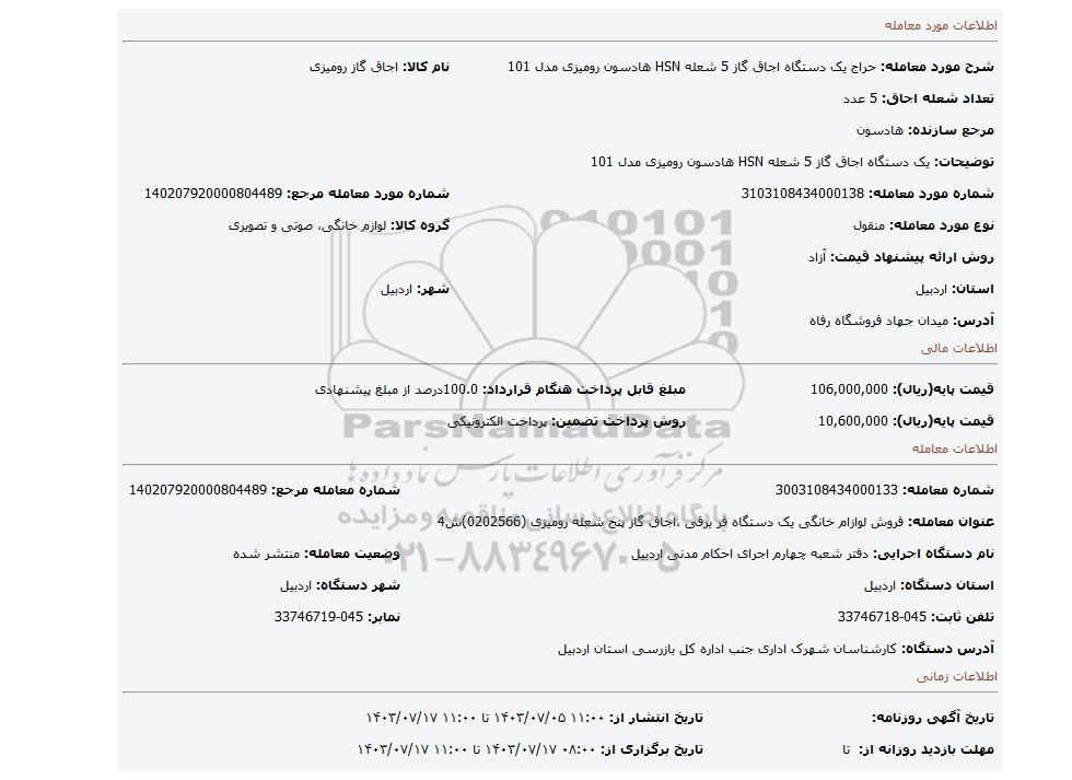 مزایده عمومی مزایده یک دستگاه اجاق گاز 5 شعله HSN هادسون رومیزی مدل 101 برگزار میگردد. از کلیه افراد متخصص و شرکت‌های واجد شرایط دعوت به عمل می‌آید تا در این مزایده با کد خبرگزاری پارس نماد : 8045067 شرکت نمایند تاریخ شروع مزایده : 1403/07/05 مهلت شرکت در مزایده: تا پایان روز 1403/07/17 مکان برگزاری اموال واگذاری استان‌های اردبیل و دسته‌بندی‌های مربوط به این حراجی متفرقه میباشد. اطلاعات دقیق‌تر درباره شرایط شرکت در مزایده آنلاین و نحوه ارسال مدارک، الزامات پروژه و دریافت اسناد مزایده و تاریخ بازگشایی پاکت‌ها، در بخش اطلاعات تکمیلی این آگهی درج شده است.
