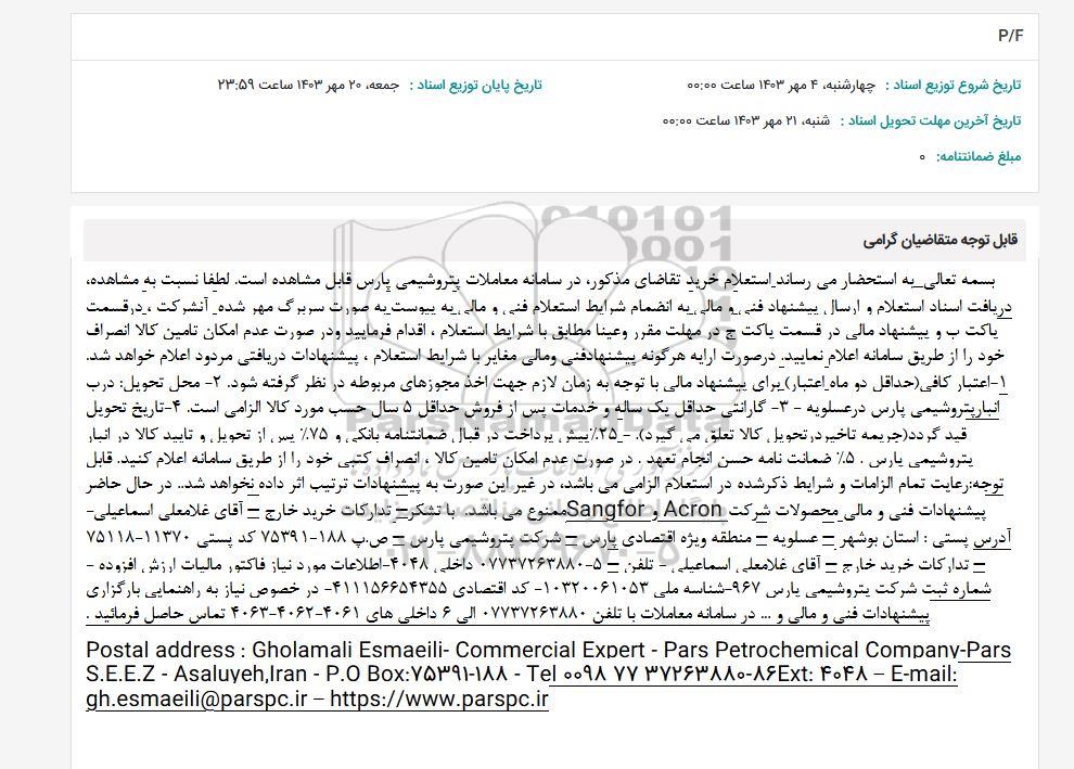 به استحضار میرساند استعلام خرید تقاضای مذکور در سامانه معاملات پتروشیمی پارس قابل مشاهده است. لطفا نسبت به مشاهده دریافت اسناد استعلام و ارسال پیشنهاد فنی و مالی به انضمام شرایط استعلام فنی و مالی به پیوست به صورت سربرگ مهر شده آنشرکت ، در قسمت پاکت ب و پیشنهاد مالی در قسمت پاکت ج در مهلت مقرر وعينا مطابق با شرایط استعلام ، اقدام فرمایید و در صورت عدم امکان تامین کالا انصراف خود را از طریق سامانه اعلام نمایید. در صورت ارایه هرگونه پیشنها دفنی و مالی مغایر با شرایط استعلام ، پیشنهادات دریافتی مردود اعلام خواهد شد. 1- اعتبار کافی حداقل دو ماه اعتبار برای پیشنهاد مالی با توجه به زمان لازم جهت اخذ مجوزهای مربوطه در نظر گرفته شود -2- محل تحویل درب انبار پتروشیمی پارس در عسلویه - - گارانتی حداقل یک ساله و خدمات پس از فروش حداقل 5 سال حسب مورد کالا الزامی است. 4- تاریخ تحویل قید گردد جریمه تاخیر در تحویل کالا تعلق می گیرد 25 درصد پیش پرداخت در قبال ضمانتنامه بانکی و 75 درصد پس از تحویل و تایید کالا در انبار پتروشیمی پارس 50 درصد ضمانت نامه حسن انجام تعهد. در صورت عدم امکان تامین کالا ، انصراف کتبی خود را از طریق سامانه اعلام کنید. قابل توجه رعایت تمام الزامات و شرایط ذکر شده در استعلام الزامی میباشد در غیر این صورت به پیشنهادات ترتیب اثر داده نخواهد شد... در حال حاضر پیشنهادات فنی و مالی محصولات شرکت Acron و Sangfor ممنوع میباشد با تشکر - تدارکات خرید خارج - آقای غلامعلی اسماعیلی آدرس پستی : استان بوشهر - عسلویه - منطقه ویژه اقتصادی پارس - شرکت پتروشیمی پارس - ص.ب 188 - 75391 کد پستی 11370-75118 تدارکات خرید خارج - آقای غلامعلی اسماعیلی - تلفن - 5-07737263880 داخلی 4048 - اطلاعات مورد نیاز فاکتور مالیات ارزش افزوده - شماره ثبت شرکت پتروشیمی پارس 967 شناسه ملی 10320061053 کد اقتصادی 411156654355 در خصوص نیاز به راهنمایی بارگزاری پیشنهادات فنی و مالی و .... در سامانه معاملات با تلفن 07737263880 الی 6 داخلی های 4061-4062-4063 تماس حاصل فرمائید .