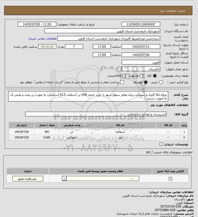 استعلام پروژه لکه گیری و آسفالت ریزی معابر سطح شهر با خرید حدود 400 تن آسفالت 013 استاندارد به صورت تن پخت و پخش آن به صورت دستی, استعلام پروژه لکه گیری و آسفالت ریزی معابر سطح شهر با خرید حدود 400 تن آسفالت 013 استاندارد به صورت تن پخت و پخش آن به صورت دستی