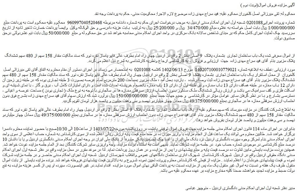 به اطلاع شرکت کنندگان در مزایده میرساند که سهم محکوم علیه از یک باب ساختمان تجاری  بشماره پلاک  9 اصلی بخش 2 واقع در اردبیل چهار راه امام بطرف عالی قاپو پاساژ نقره نور که سند مالکیت مقدار 158 سهم از 480 سهم ششدانگ پلاک مزبور بنام  آقای محمد سراج مهدی زاده بدون احتساب ارزش سرقفلی مغازه ها در سالجاری بمبلغ 49/375/000/000 ریال معادل چهار میلیاردو نهصد و سی وهفت میلیون و پانصد هزار تومان بفروش خواهد رفت .