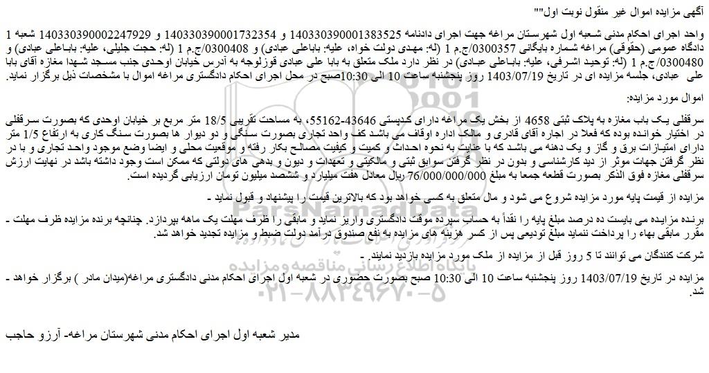 واحد اجرای احکام مدنی شعبه اول شهرستان مراغه جهت اجرای دادنامه 140330390001383525 و 140330390001732354 و 140330390002247929 شعبه 1 دادگاه عمومی (حقوقی) مراغه شماره بایگانی 0300357/ج.م 1 (له: مهدی دولت خواه، علیه: باباعلی عبادی) و 0300408/ج.م 1 (له: حجت جلیلی، علیه: باباعلی عبادی) و 0300480/ج.م 1 (له: توحید اشرفی، علیه: باباعلی عبادی) در نظر دارد ملک متعلق به بابا علی عبادی قوزلوجه به آدرس خیابان اوحدی جنب مسجد شهدا مغازه آقای بابا علی عبادی، جلسه مزایده ای در تاریخ 1403/07/19 روز پنجشنبه ساعت 10 الی 10:30صبح در محل اجرای احکام دادگستری مراغه اموال با مشخصات ذیل برگزار نماید.