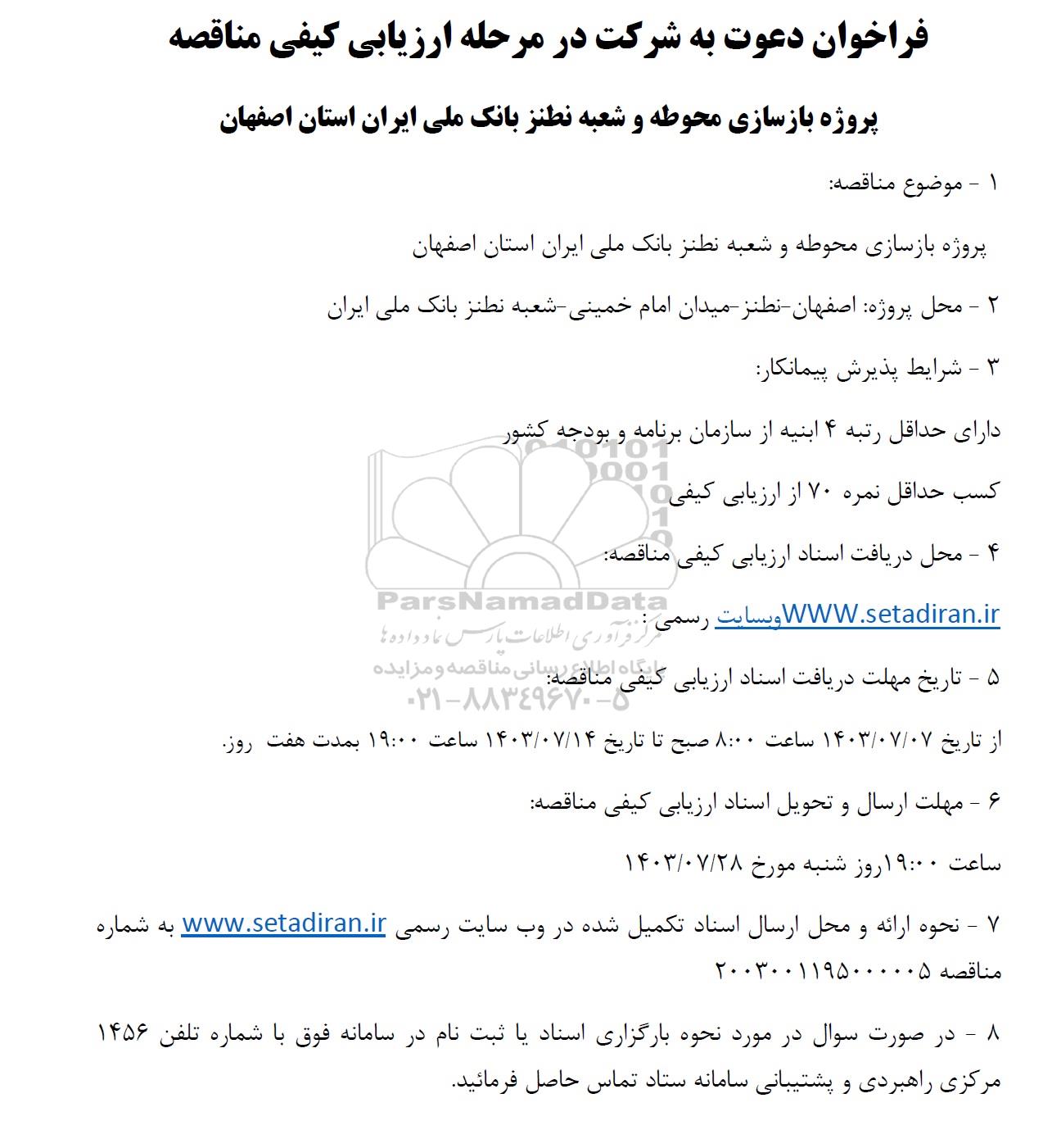 فراخوان دعوت به شرکت در مرحله ارزیابی کیفی مناقصه پروژه بازسازی محوطه و شعبه نطنز بانک ملی ایران استان اصفهان