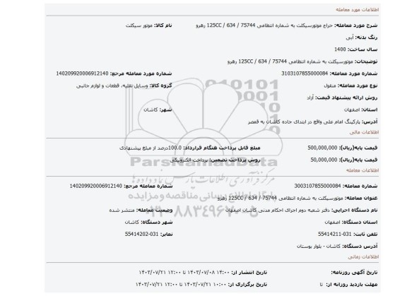 | عنوان معامله: موتورسیکلت به شماره انتظامی 75744 / 634 / 125CC رهرو | ||