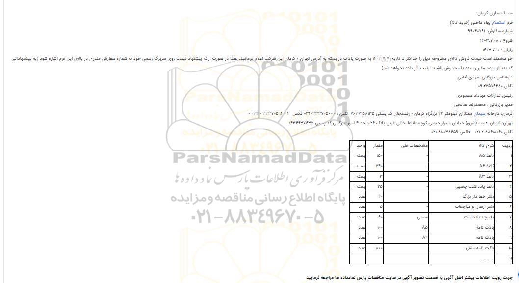خواهشمند است قیمت فروش کالای مشروحه ذیل را حداکثر تا تاریخ 1403.7.7 به صورت پاکات در بسته به آدرس تهران / کرمان این شرکت اعلام فرمائید. لطفا در صورت ارائه پیشنهاد قیمت روی سربرگ رسمی خود به شماره سفارش مندرج در بالای این فرم اشاره شود (به پیشنهاداتی که بعد از موعد مقرر رسیده یا مخدوش باشند ترتیب اثر داده نخواهد شد)