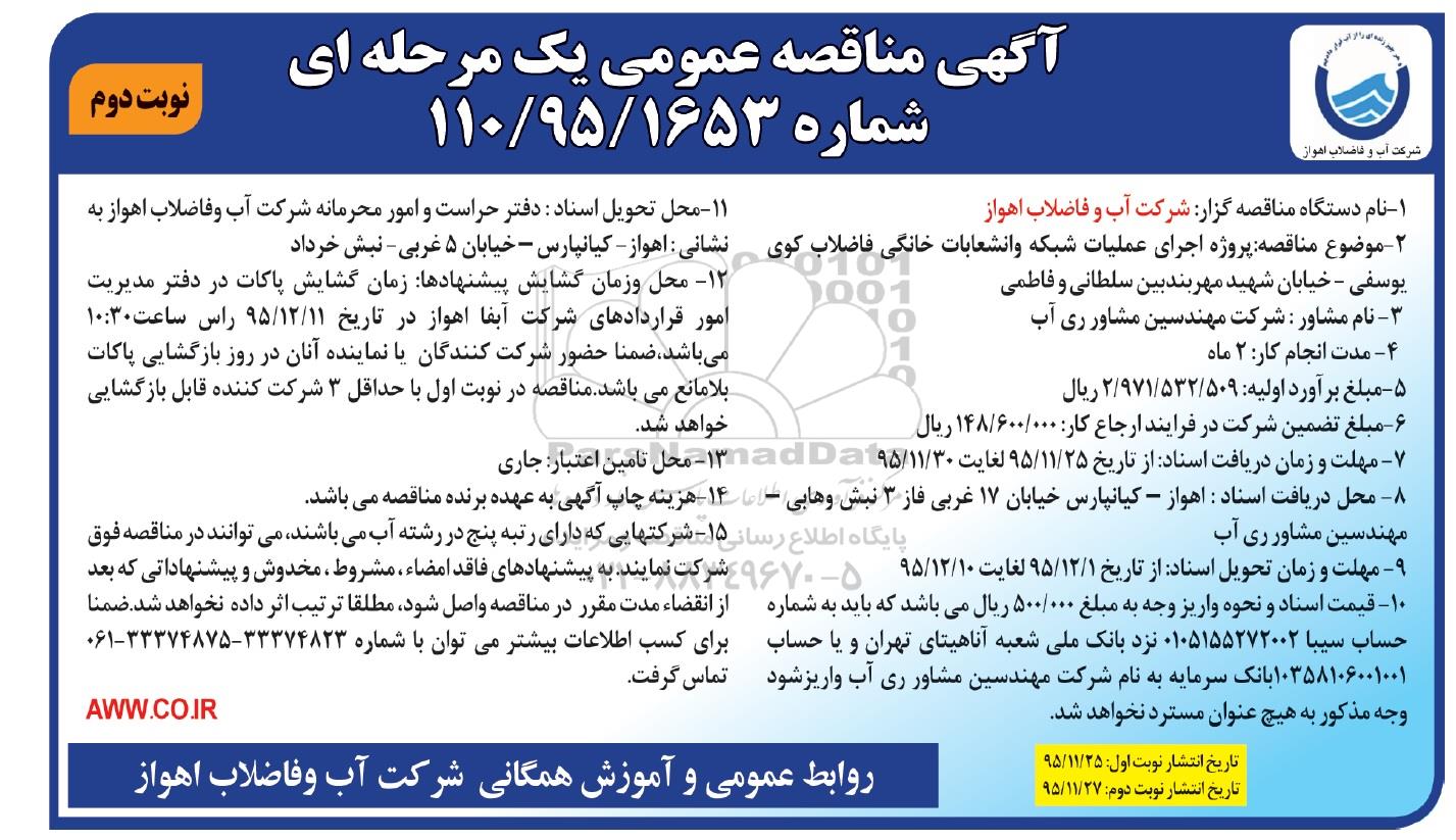 مناقصه اجرای عملیات شبکه و انشعابات خانگی فاضلاب کوی یوسفی..... نوبت دوم از کلیه افراد متخصص و شرکتها واجد شرایط دعوت به عمل میآید در مناقصه با کد خبرگزاری پارس نماد: 805688 شرکت نمایند.
