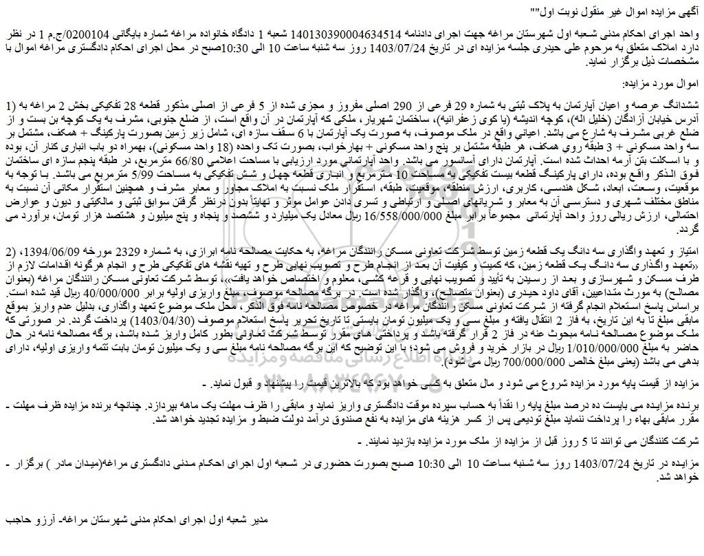 واحد اجرای احکام مدنی شعبه اول شهرستان مراغه جهت اجرای دادنامه 140130390004634514 شعبه 1 دادگاه خانواده مراغه شماره بایگانی 0200104/ج.م 1 در نظر دارد املاک متعلق به مرحوم علی حیدری جلسه مزایده ای در تاریخ 1403/07/24 روز سه شنبه ساعت 10 الی 10:30صبح در محل اجرای احکام دادگستری مراغه اموال با مشخصات ذیل برگزار نماید.