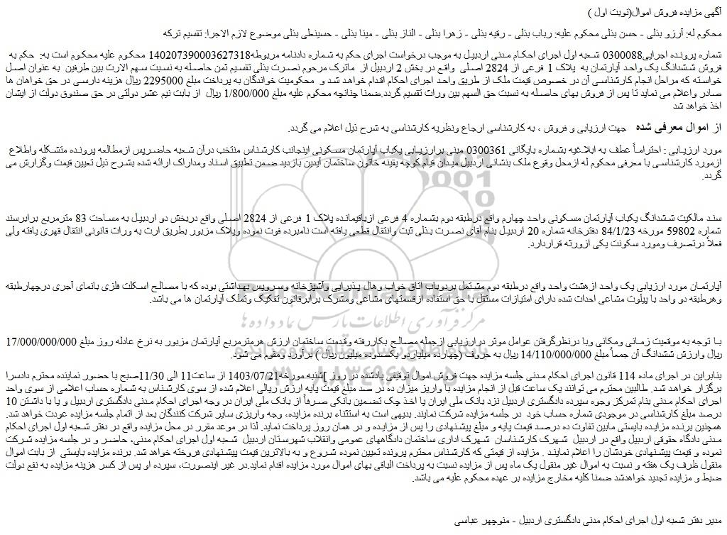 شماره پرونده اجرایی0300088 شعبه اول اجرای احکام مدنی اردبیل به موجب درخواست اجرای حکم به شماره دادنامه مربوطه140207390003627318 محکوم علیه محکوم است به:  حکم به فروش ششدانگ یک واحد آپارتمان به  پلاک 1 فرعی از 2824 اصلی  واقع در بخش 2 اردبیل از  ماترک مرحوم نصرت بذلی تقسیم ثمن حاصله به نسبت سهم الارث بین طرفین  به عنوان اصل خواسته که مراحل انجام کارشناسی آن در خصوص قیمت ملک از طریق واحد اجرای احکام اقدام خواهد شد و  محکومیت خواندگان به پرداخت مبلغ 2295000 ریال هزینه دارسی در حق خواهان ها صادر واعلام می نماید تا پس از فروش بهای حاصله به نسبت حق السهم بین وراث تقسیم گردد.ضمنا چنانچه محکوم علیه مبلغ 1/800/000 ریال  از بابت نیم عشر دولتی در حق صندوق دولت از ایشان اخذ خواهد شد