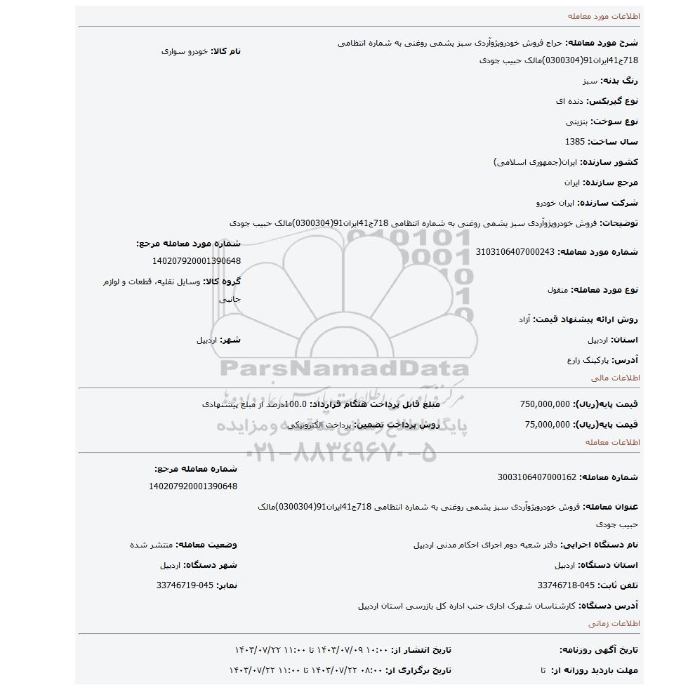 شرح مورد معامله: حراج فروش خودروپژوآردی سبز یشمی روغنی به شماره انتظامی 718ج41ایران91(0300304)مالک حبیب جودی | نام کالا: خودرو سواری | |