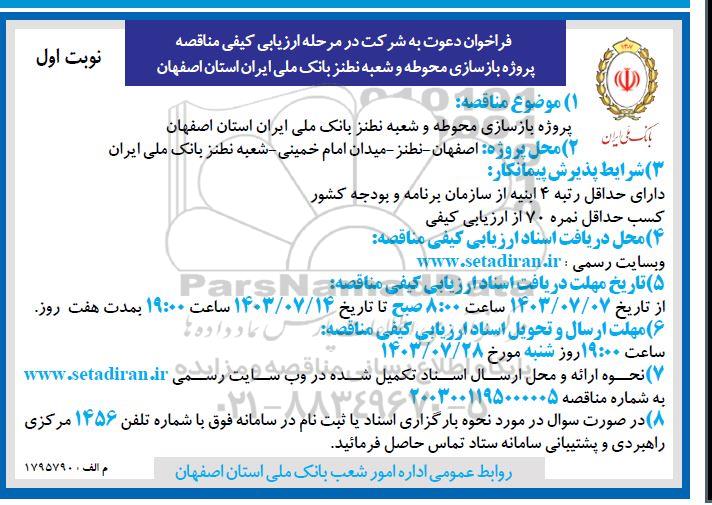 1- موضوع مناقصه: پروژه بازسازی محوطه و شعبه نطنز بانک ملی ایران استان اصفهان