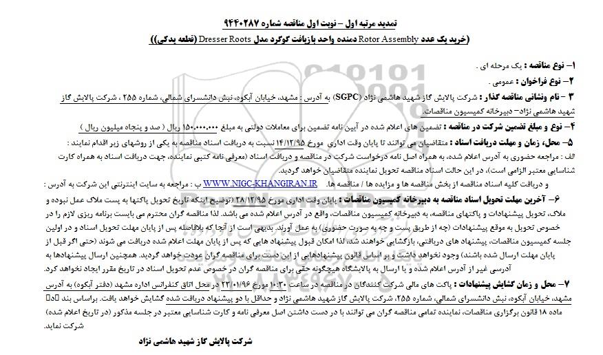 تمدید مرتبه اول- نوبت اول مناقصه خرید یک عدد Rotor Assembly دمنده واحد بازیافت گوگرد از کلیه افراد متخصص و شرکتها واجد شرایط دعوت به عمل میآید در مناقصه با کد خبرگزاری پارس نماد: 806336 شرکت نمایند.