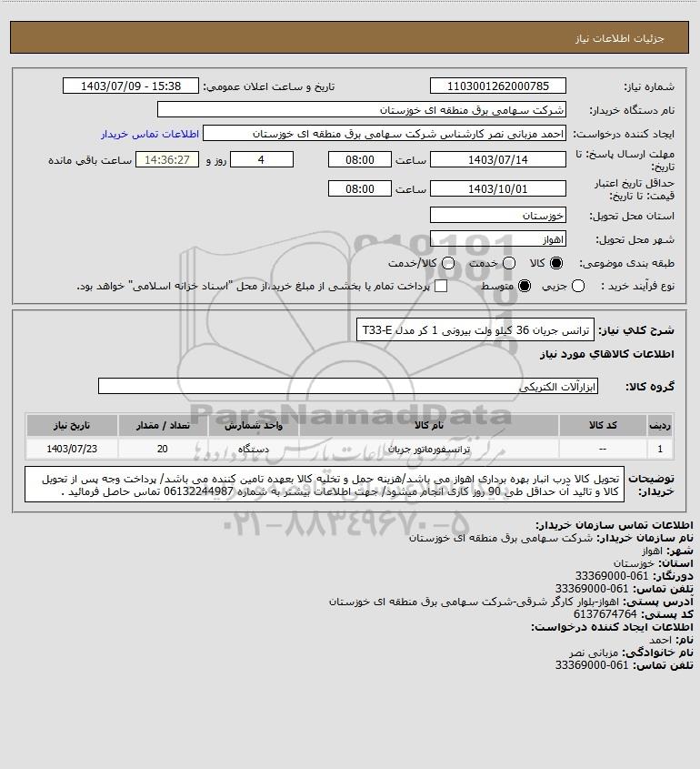شرح کلی نیاز: ترانس جریان 36 کیلو ولت بیرونی 1 کر مدل T33-E