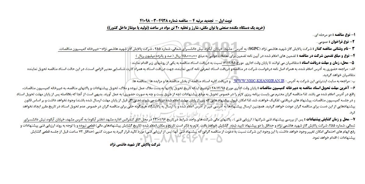نام و نشانی مناقصه گذار: شرکت پالایش گاز شهید هاشمی نژاد (SGPC) به آدرس: مشهد، خیابان آبکوه، نبش دانشسرای شمالی، شماره 255 ، شرکت پالایش گاز شهید هاشمی نژاد، دبیرخانه کمیسیون منقاصات