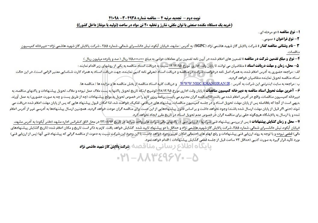 نام و نشانی مناقصه گذار: شرکت پالایش گاز شهید هاشمی نژاد (SGPC) به آدرس: مشهد، خیابان آبکوه، نبش دانشسرای شمالی، شماره 255 ، شرکت پالایش گاز شهید هاشمی نژاد، دبیرخانه کمیسیون منقاصات