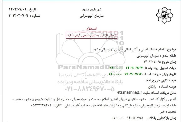 موضوع : انجام خدمات ایمنی و آتش نشانی سازمان اتوبوسرانی مشهد