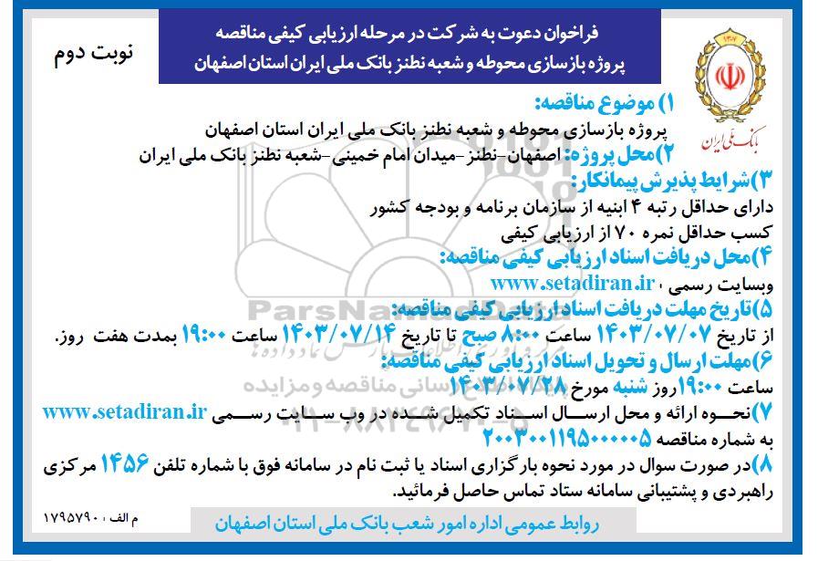 مناقصه پروژه بازسازی محوطه و شعبه نطنز بانک - نوبت دوم , مناقصه پروژه بازسازی محوطه و شعبه نطنز بانک - نوبت دوم