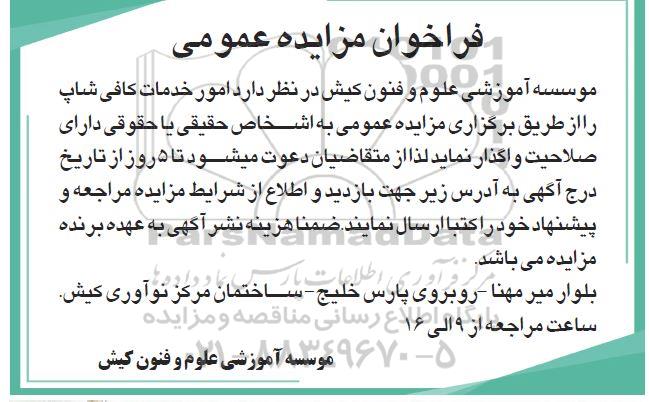 موسسه آموزشی علوم و فنون کیش در نظر دارد امور خدمات کافی شاپ را از طریق برگزاری مزایده عمومی به اشخاص حقیقی یا حقوقی دارای صلاحیت واگذار نماید لذا از متقاضیان دعوت میشود تا 5 روز از تاریخ درج آگهی به آدرس زیر جهت بازدید و اطلاع از شرایط مزایده مراجعه و پیشنهاد خود را کتبا ارسال نمایند. ضمنا هزینه نشر آگهی به عهده برنده مزایده می باشد.