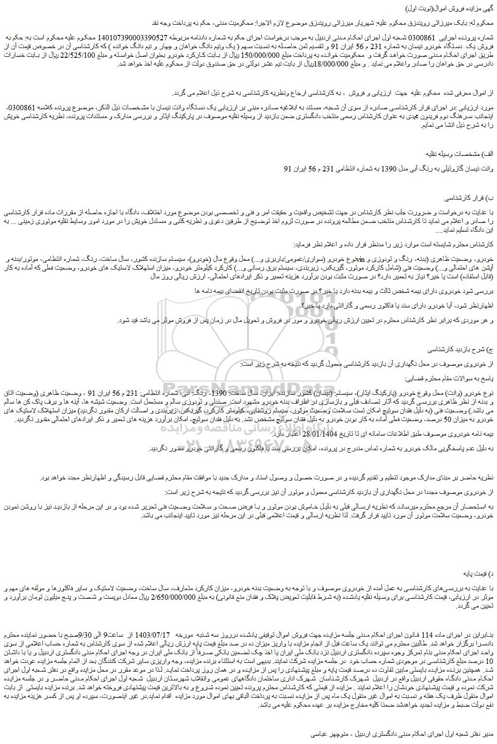 شماره پرونده اجرایی 0300861 شعبه اول اجرای احکام مدنی اردبیل به موجب درخواست اجرای حکم به شماره دادنامه مربوطه 140107390003390527 محکوم علیه محکوم است به: حکم به فروش یک دستگاه خودرو نیسان به شماره 231 م 56 ایران 91 و تقسیم ثمن حاصله به نسبت سهم ( یک ونیم دانگ خواهان و چهار و نیم دانگ خوانده ) که کارشناسی آن در خصوص قیمت آن از طریق اجرای احکام مدنی صورت خواهد گرفت و محکومیت خوانده به پرداخت مبلغ 150/000/000 ریال از بابت کارکرد خودرو بعنوان اصل خواسته و مبلغ 22/525/100 ریال از بابت خسارات دادرسی در حق خواهان را صادر واعلام می نماید . و مبلغ 18/000/000ریال از بابت نیم عشر دولتی در حق صندوق دولت از محکوم علیه اخذ خواهد شد.