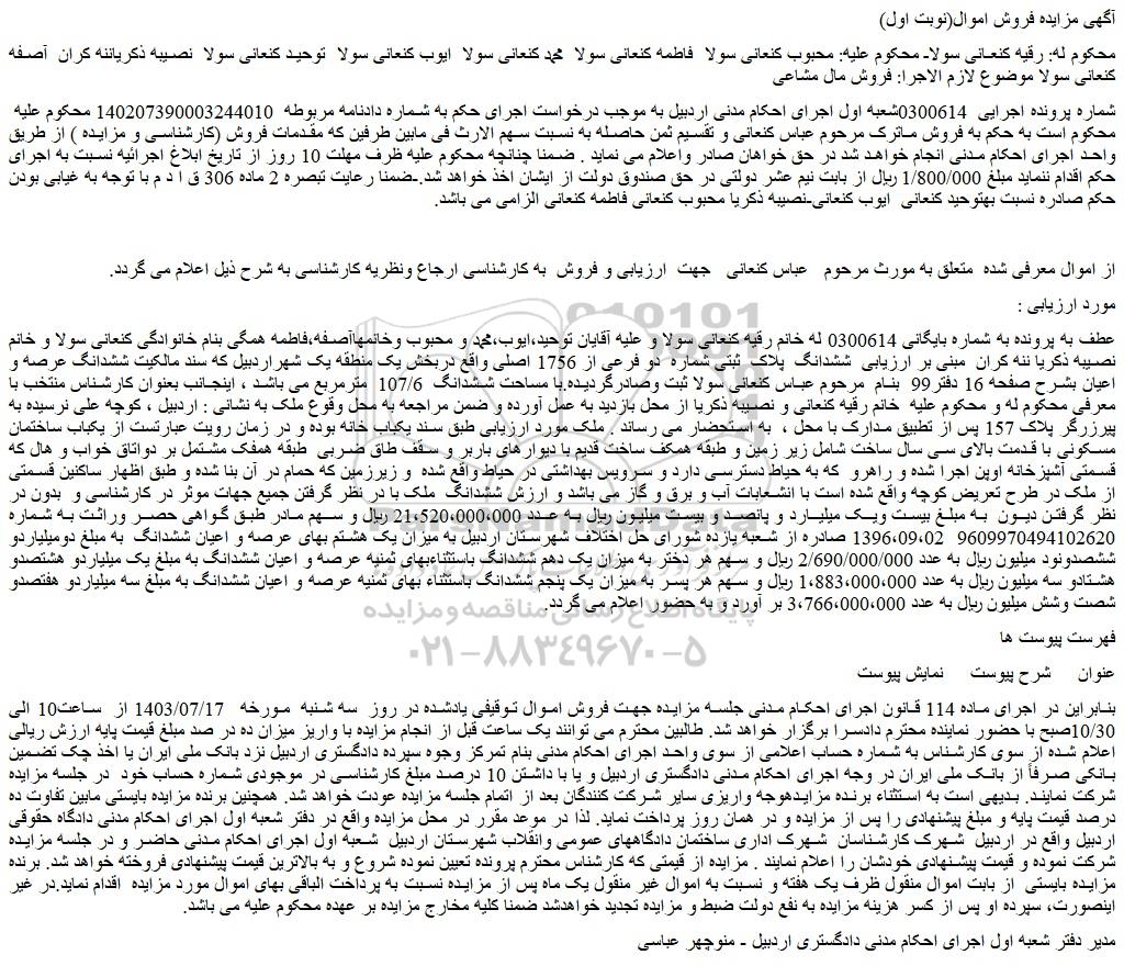 شماره پرونده اجرایی  0300614شعبه اول اجرای احکام مدنی اردبیل به موجب درخواست اجرای حکم به شماره دادنامه مربوطه  140207390003244010 محکوم علیه محکوم است به حکم به فروش ماترک مرحوم عباس کنعانی و تقسیم ثمن حاصله به نسبت سهم الارث فی مابین طرفین که مقدمات فروش (کارشناسی و مزایده ) از طریق واحد اجرای احکام مدنی انجام خواهد شد در حق خواهان صادر واعلام می نماید . ضمنا چنانچه محکوم علیه ظرف مهلت 10 روز از تاریخ ابلاغ اجرائیه نسبت به اجرای حکم اقدام ننماید مبلغ 1/800/000 ریال از بابت نیم عشر دولتی در حق صندوق دولت از ایشان اخذ خواهد شد.-ضمنا رعایت تبصره 2 ماده 306 ق ا د م با توجه به غیابی بودن حکم صادره نسبت بهتوحید کنعانی  ایوب کنعانی-نصیبه ذکریا محبوب کنعانی فاطمه کنعانی الزامی می باشد.