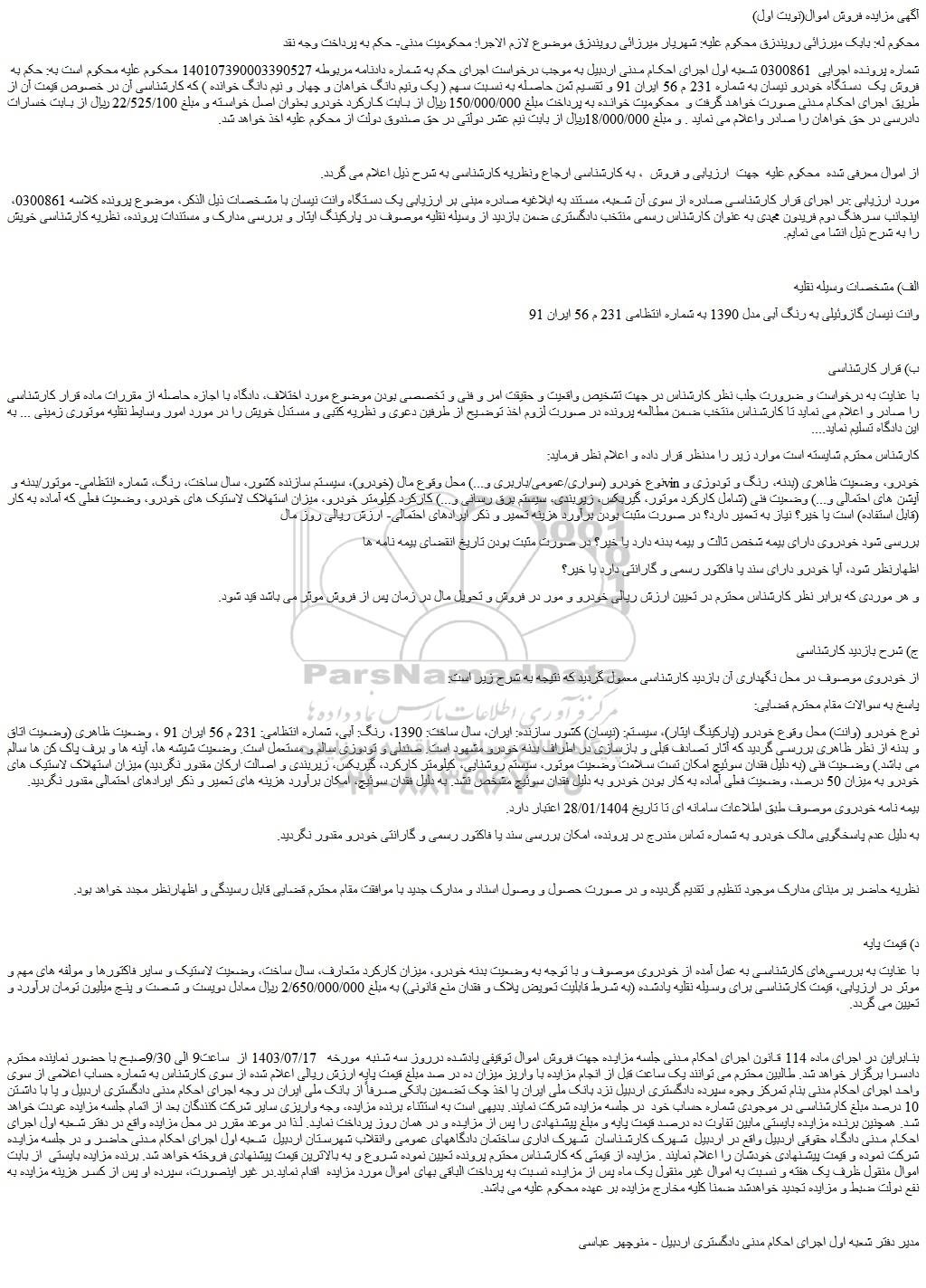 شماره پرونده اجرایی 0300861 شعبه اول اجرای احکام مدنی اردبیل به موجب درخواست اجرای حکم به شماره دادنامه مربوطه 140107390003390527 محکوم علیه محکوم است به: حکم به فروش یک دستگاه خودرو نیسان به شماره 231 م 56 ایران 91 و تقسیم ثمن حاصله به نسبت سهم ( یک ونیم دانگ خواهان و چهار و نیم دانگ خوانده ) که کارشناسی آن در خصوص قیمت آن از طریق اجرای احکام مدنی صورت خواهد گرفت و محکومیت خوانده به پرداخت مبلغ 150/000/000 ریال از بابت کارکرد خودرو بعنوان اصل خواسته و مبلغ 22/525/100 ریال از بابت خسارات دادرسی در حق خواهان را صادر واعلام می نماید . و مبلغ 18/000/000ریال از بابت نیم عشر دولتی در حق صندوق دولت از محکوم علیه اخذ خواهد شد.