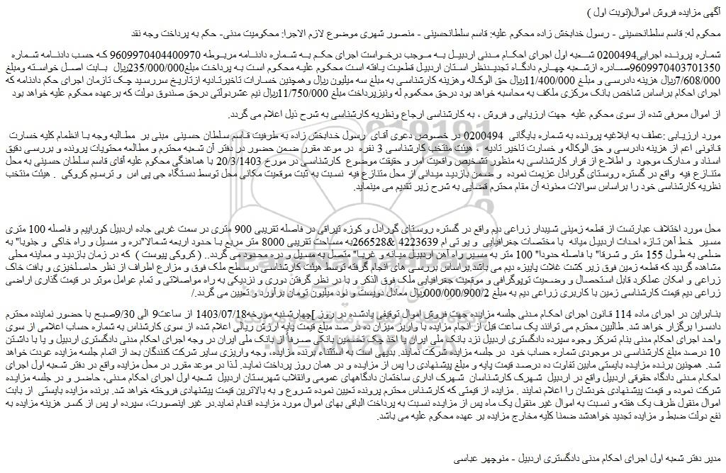 شعبه صادر کننده:شعبه اول اجرای احکام مدنی دادگستری شهرستان اردبیل/قدیم