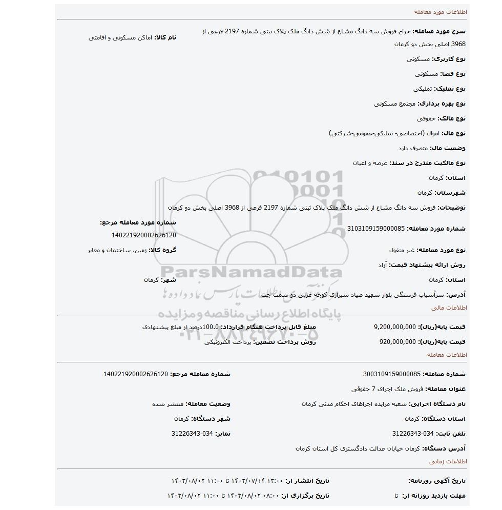 | شرح مورد معامله: حراج فروش سه دانگ مشاع از شش دانگ ملک پلاک ثبتی شماره 2197 فرعی از 3968 اصلی بخش دو کرمان | نام کالا: اماکن مسکونی و اقامتی | |