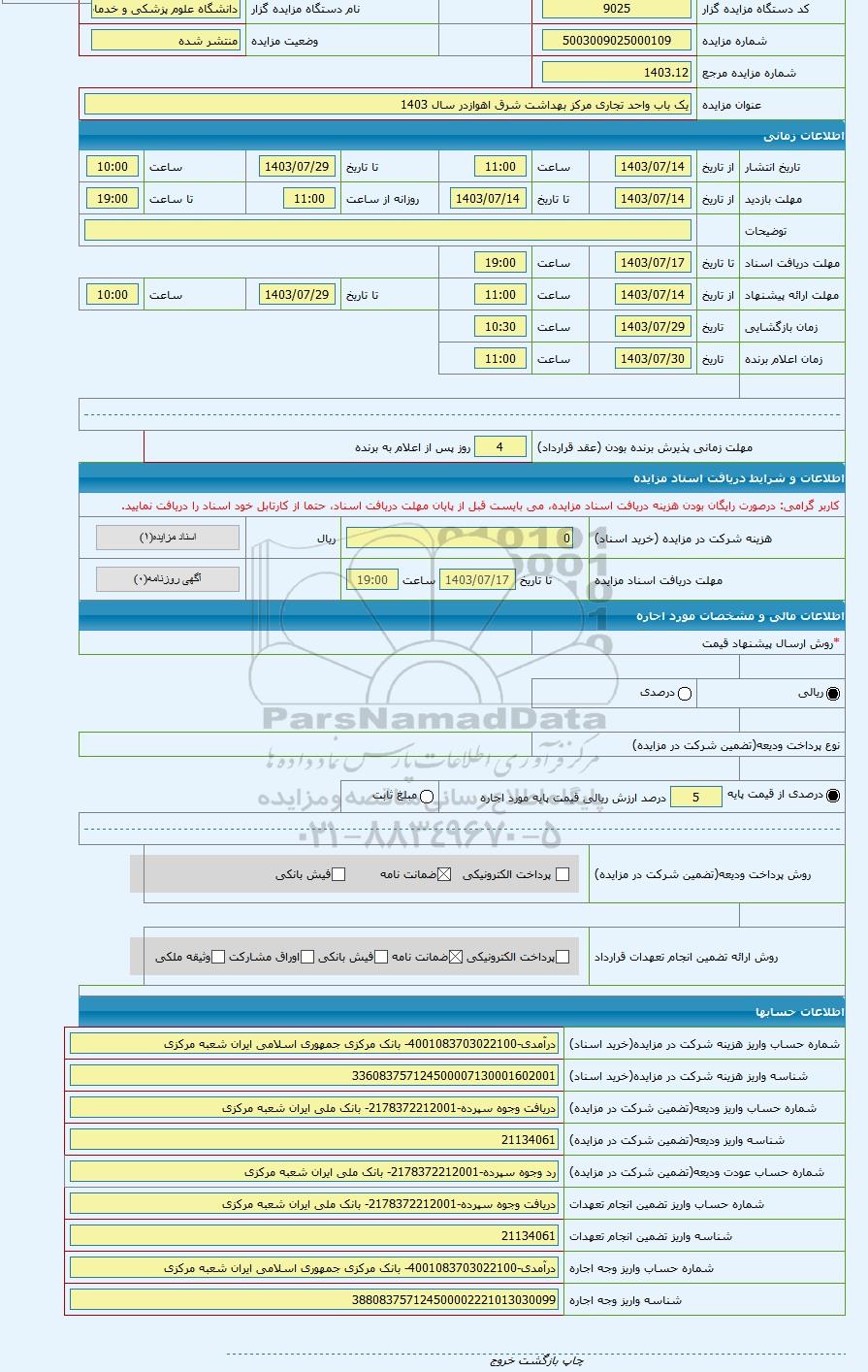 | عنوان مزایده | یک باب واحد تجاری مرکز بهداشت شرق اهوازدر سال 1403 | |||