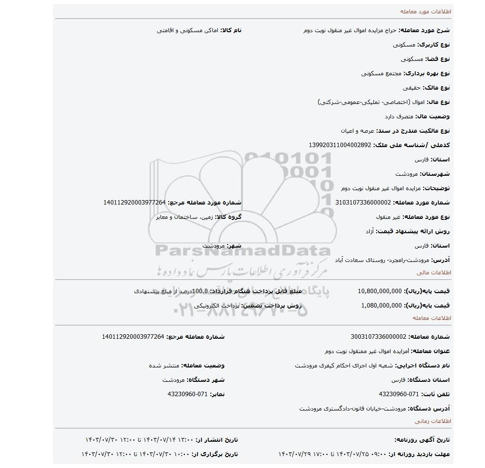 | شماره مورد معامله: 3103107336000002 | شماره مورد معامله مرجع: 140112920003977264 | |