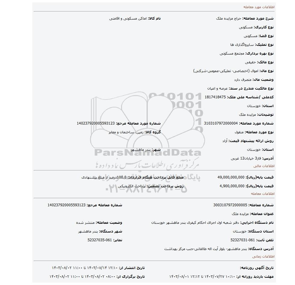 | شماره مورد معامله: 3103107972000004 | شماره مورد معامله مرجع: 140237920005593123 | |