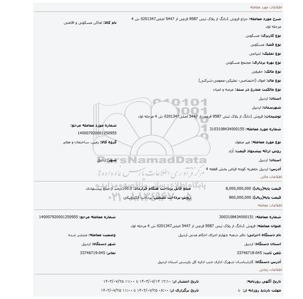 قیمت پایه(ریال): 800,000,000 | روش پرداخت تضمین: پرداخت الکترونیکی |